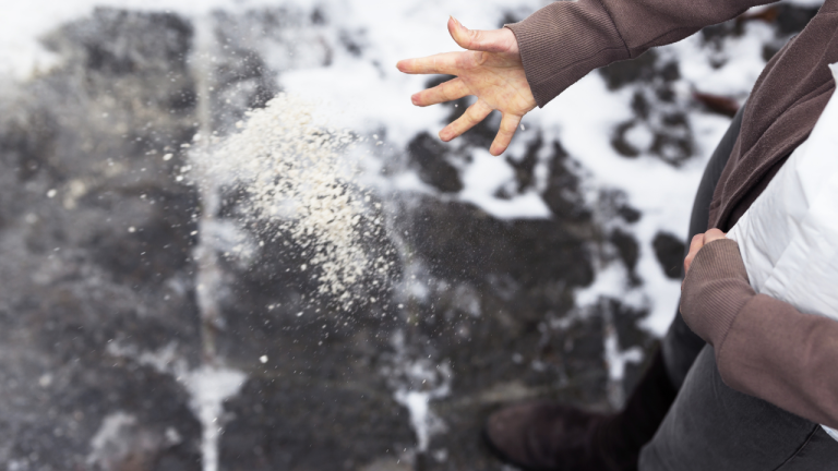 Um Glätte vorzubeugen, streuen wir abgestimmt auf Wetterlage Salz oder Splitt – für optimalen Halt.